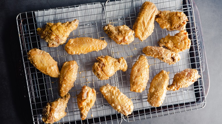 Instead of laying out paper towels after frying, there are other methods that work like a charm to allow for better airflow, including crumpling up your paper towels or using a wire rack set over a baking dish. Both of these methods allow your food to cool and crisp up without accidentally steaming it — so all your hard work on frying the perfect chicken won't go to waste.