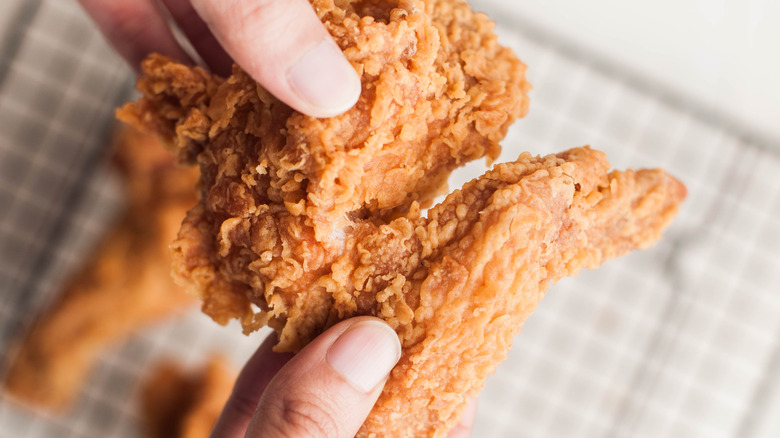 When it comes to your breading, one mistake is double dipping when dredging as it causes a sogginess. This is because adding too much flour can cause the food to absorb more oil. To prevent this, make sure you're only coating your chicken once — and shake off any excess dredging to ensure only a thin layer is left behind.