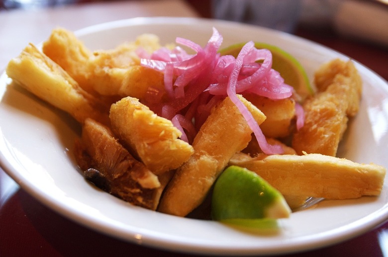 1. Bring a large pot of water to a boil in a large saucepan. Add the yucca and blanch until just tender, about 4 minutes. Remove from heat, drain, and pat dry.