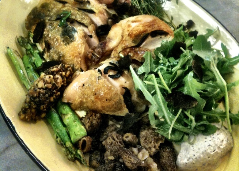 Recently I hit the restaurant to check out Hellen's poularde en mourning—a four-course feast based around a beautiful Four Story Hill Farm chicken from Pennsylvania. The birds are "milk fed" using dried pellets and butchered at the peak of adolescence, when the breasts are plumpest. The meal kicked off with an amuse of chicken liver mousse spiked with shallots; a golden olive oil stream encircled the rich spread. Following was a poached farm egg over a spring risotto (with peas and ramps). Then the bird arrived, first whole for a formal presentation, complete with Hellen in his chef's whites, then sliced in the pictured presentation.