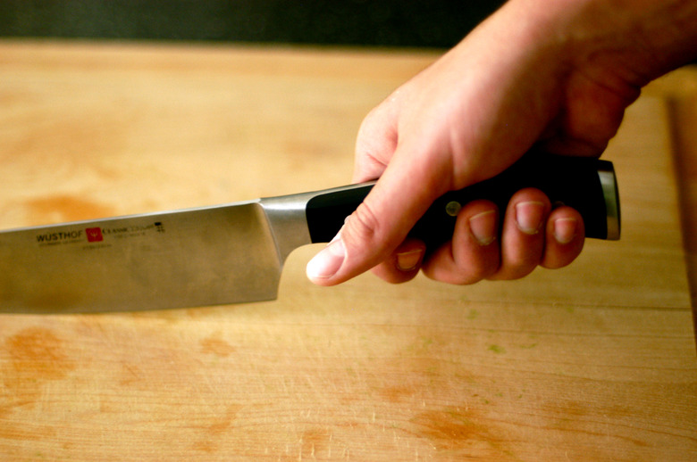 - Take your thumb and index finger and pinch the base of the blade of your knife where it runs into the handle. Your thumb should stay resting on one side, while your index finger holds it firm on the other side.