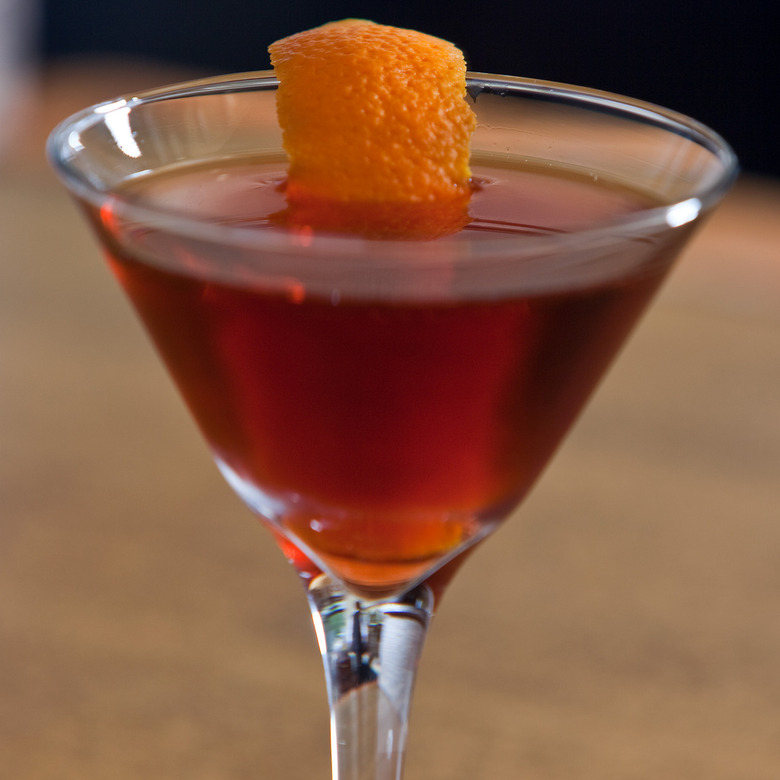 - Strain into a cocktail glass, coupe or into a rocks glass over a single large cube of ice. Garnish with orange peel twist.