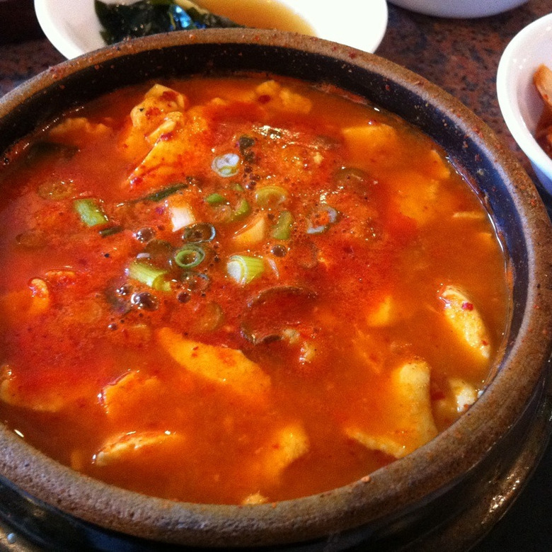One might assume, rightfully so, that if I had a cold I might hit the Jewish deli for some good old-fashioned golden penicillin. I live on the Upper West Side, after all, and come from people who believe this shimmering homemade concoction will cure everything from swine flu to a breakup (apparently he wasn't right for me anyway, bubbala). In fact, my cure-all is soon dubu chigae, Korean soft tofu soup that is pungent, spicy and soothing all at once. And I do have a cold. So soon dubu it is.