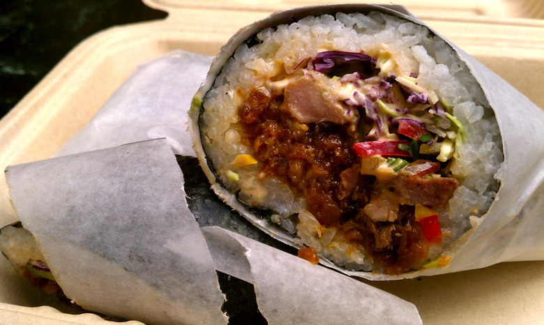 First and foremost, the sushi burrito, or sushirrito. San Francisco fusion factory Sushirrito churns out what might possibly be the most delicious and user-friendly example of fusion cuisine I've ever encountered. The concept is basic: giant burrito-sized sushi rolls with names like The Yakuza and Geisha's Kiss, filled with all your favorite traditional (and sustainable) sushi ingredients. And then there's my favorite, The Porkivore, a fresh play on the Reuben sandwich with roasted pork belly, shaved cabbage, melted swiss and mustard seed mayo. Melted cheese and mustard in a sushi roll? You bet your santoku knife. Just this one time, though.