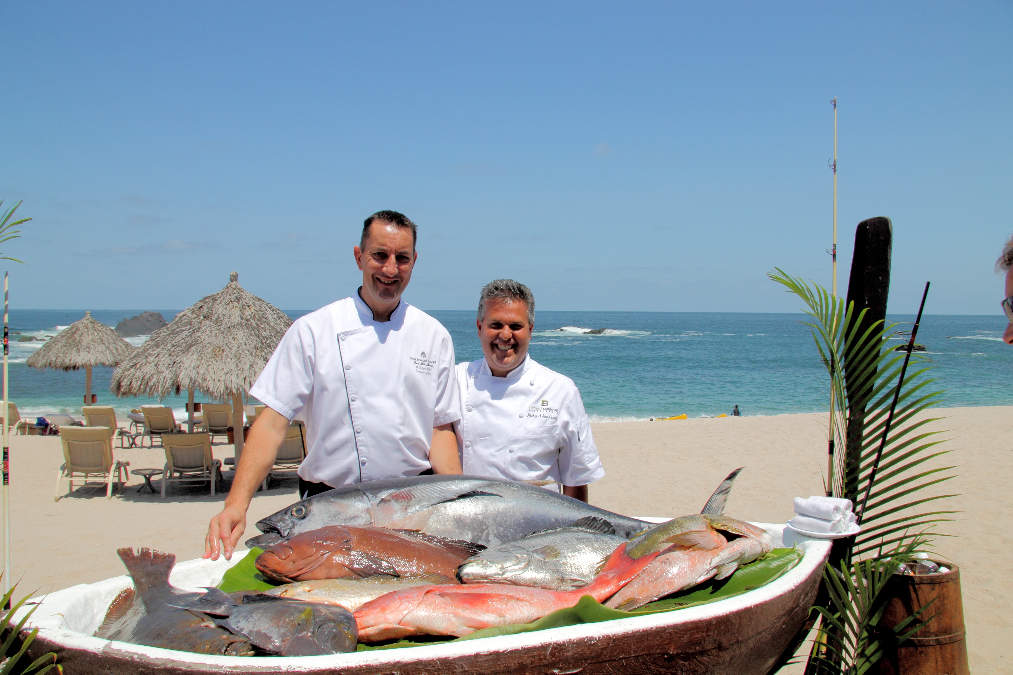 Renowned chef Richard Sandoval oversees the restaurants at Four Seasons Punta Mita, and today he's on property to check in on the team. He's joined beachside by the hotel's executive chef Philippe Piel to watch the daily catch come ashore.