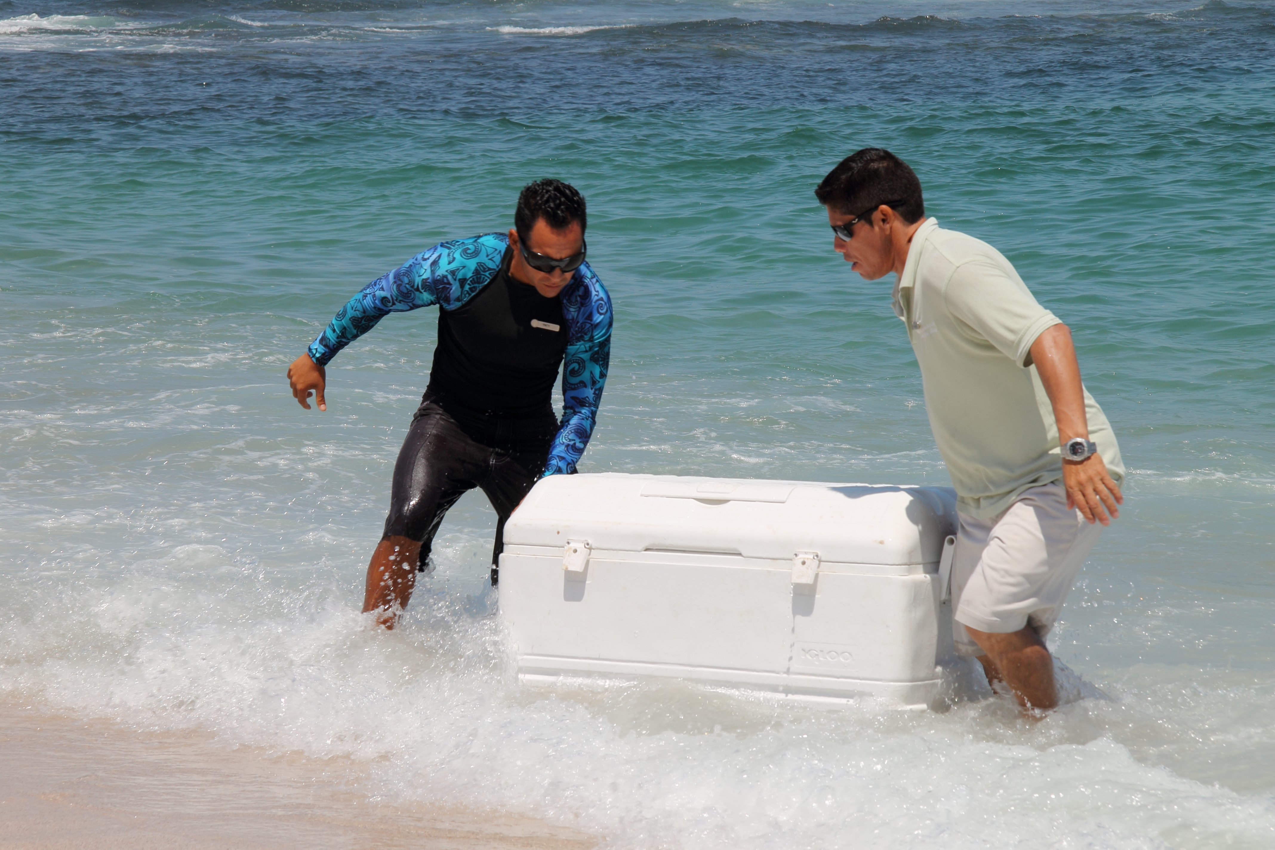 A beach butler and one of the hotel's lifeguards wade into the surf, waves crashing into their chests and faces, to greet the fishermen. Not much bigger than a dinghy, the boat holds only two fishermen, and it takes their combined strength to hoist a large insulated cooler over the edge. The heavy package splashes into the surf. The staff signal "OK" to the fishermen, grab the cooler and haul it to shore, running barefoot through the blazing-hot sand to the resort's beachfront restaurant, Bahía.