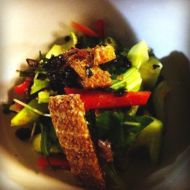 I had a really awesome sushi roll the other day. I ordered a salmon skin roll, as I frequently do because salmon skin is one of the best and most underutilized parts of the fish (also see: collar). But instead of thin strips of delicious, fatty, crisp salmon skin, the roll was full of finely chopped extra-crispy salmon skin bits. They looked just like bacon bits, and somehow tasted even better. The crunchy, meaty fragments against the soft, tangy-sweet rice was a rare kind of textural bliss.