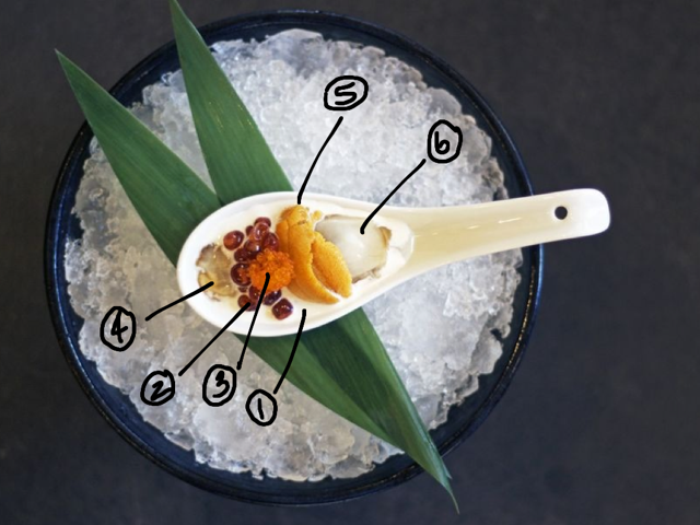 4 and 6. Raw oyster | "We use a local Rappahannock Olde Salt oyster from Chincoteague Bay because it's not overly briny, and the small cup of the oyster makes it just the right size."