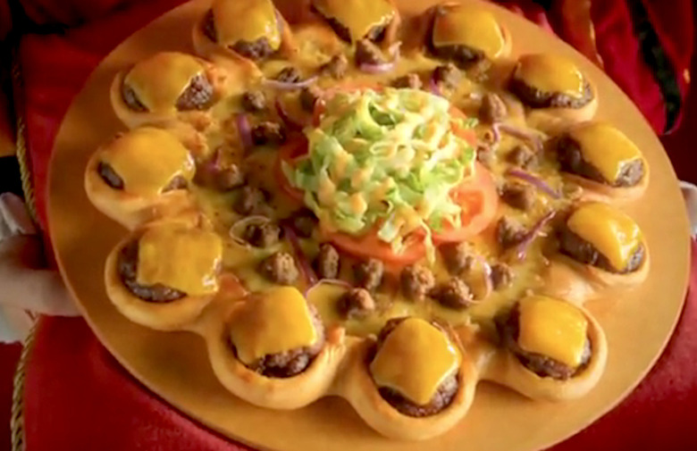 Regardless of where this pizza is available, the message is loud and clear. This is the best pizza that has ever existed anywhere in the entire world. It has mini-cheeseburgers AND it is pizza. It's so good they announce its arrival to the table by velvet-cloaked trumpeters. White doves wouldn't have been over the top in this case.