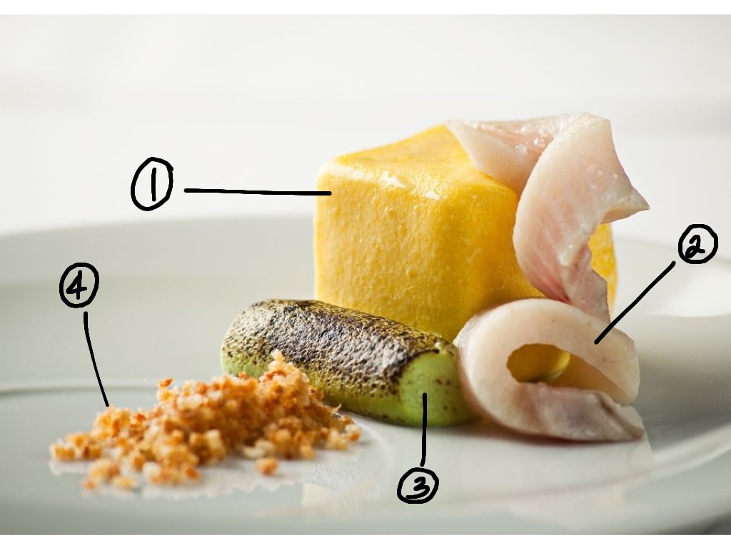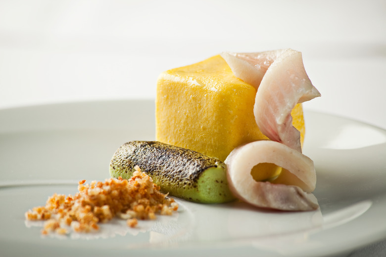 3. Charred Avocado | "This is avocado, and yogurt and mustard, blended together with lemon juice, and then it's piped out and burnt with a blow torch. It lends a nice smokey, charred element to the dish."