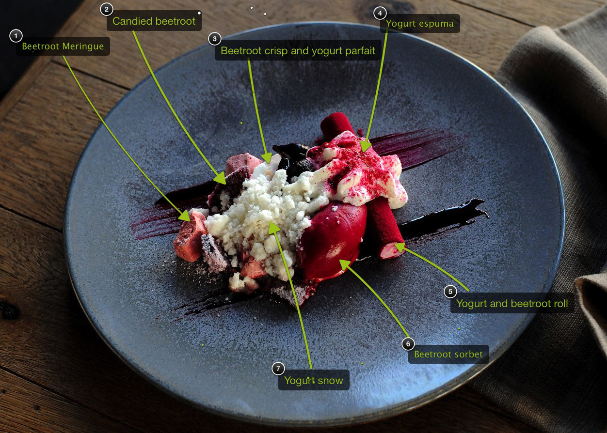 - Beetroot crisp and yogurt parfait | "We combine beet puree with N Zorbit [which can turn liquid fats to powder] and spread it very thin on a plastic mat. The N Zorbit helps make the puree crispy. The yoghurt parfait is essentially a frozen mousse with diced beetroot and port added."