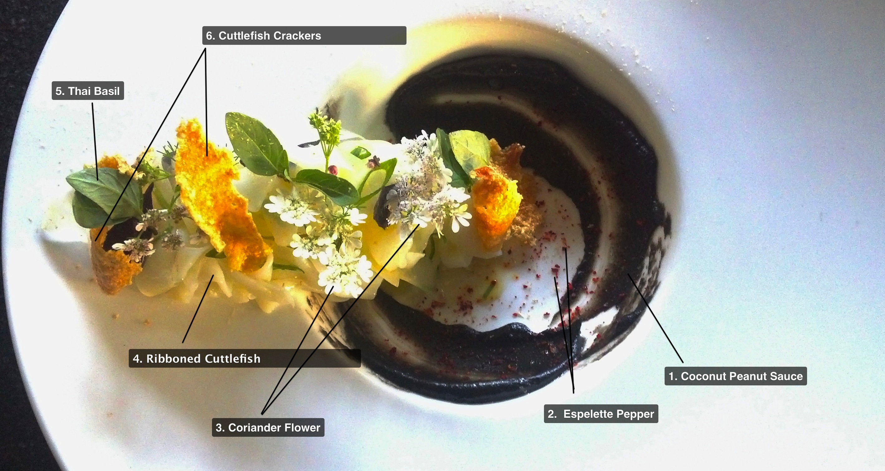 1. Coconut Peanut Sauce | Voltaggio brushes the mixture made up of traditional Asian ingredients, but blackened in color with the addition of black lime, around the inside of the plate.