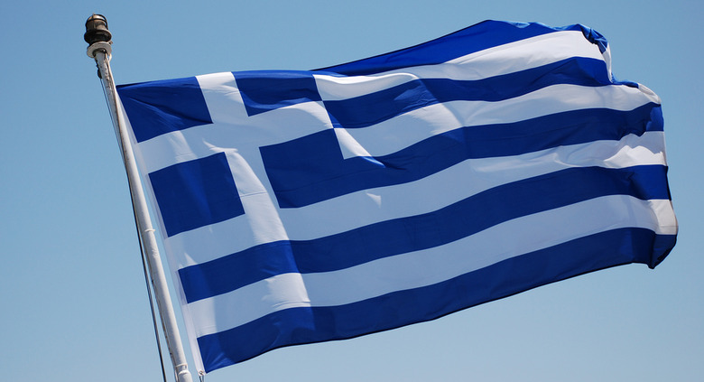 Know your souvlaki (clockwise from left): Greece's flag, Kokoretsi on a spit, horiatiki salad, grilled whole lavraki (or sea b