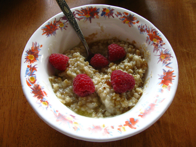 This is not your average Quaker oatmeal and certainly not your apple cinnamon insta-glue. Steel-cut oats are made from the much harder, denser whole inner kernel (which needs a powerful steel blade to process it, hence "steel-cut"), and regular oatmeal is made with rolled oats: flattened, steamed oat kernel flakes. Like polenta and risotto, this slow-cooking grain needs stirring and attention, but the creamy texture is richer and the nutty flavor more intense — totally worth the extra effort. As for the fiber content, well, you'll see.
