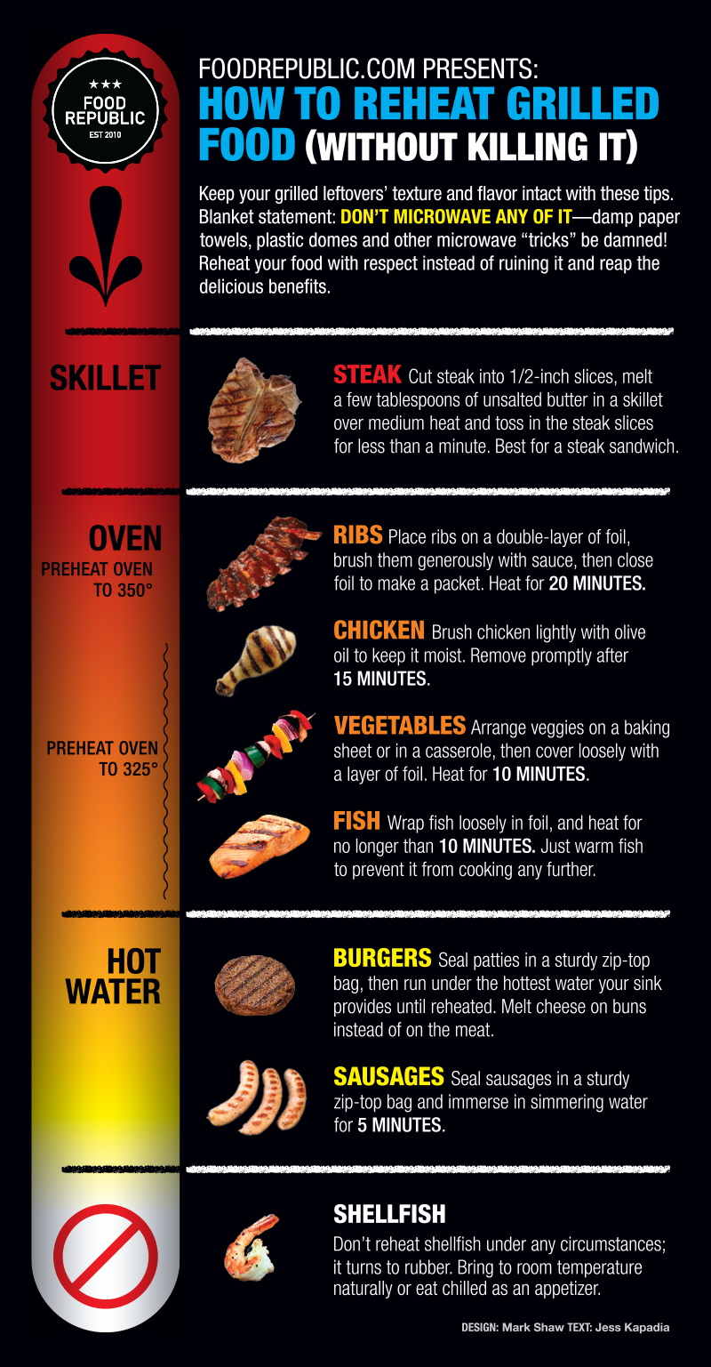 Infographic: How To Reheat Grilled Food Without Killing It Jess Kapadia and Mark ShawUpdated: June 8, 2015 3:47 pm EST More helpful infographics on Food Republic: Beer and Food Pairing Chart Where Food Goes On The Grill Chart Proves There Are Way More Purple Fruits And Vegetables Than We Imagined All Sorts Of Facts About Tequila That Will Help You Drink Smarter